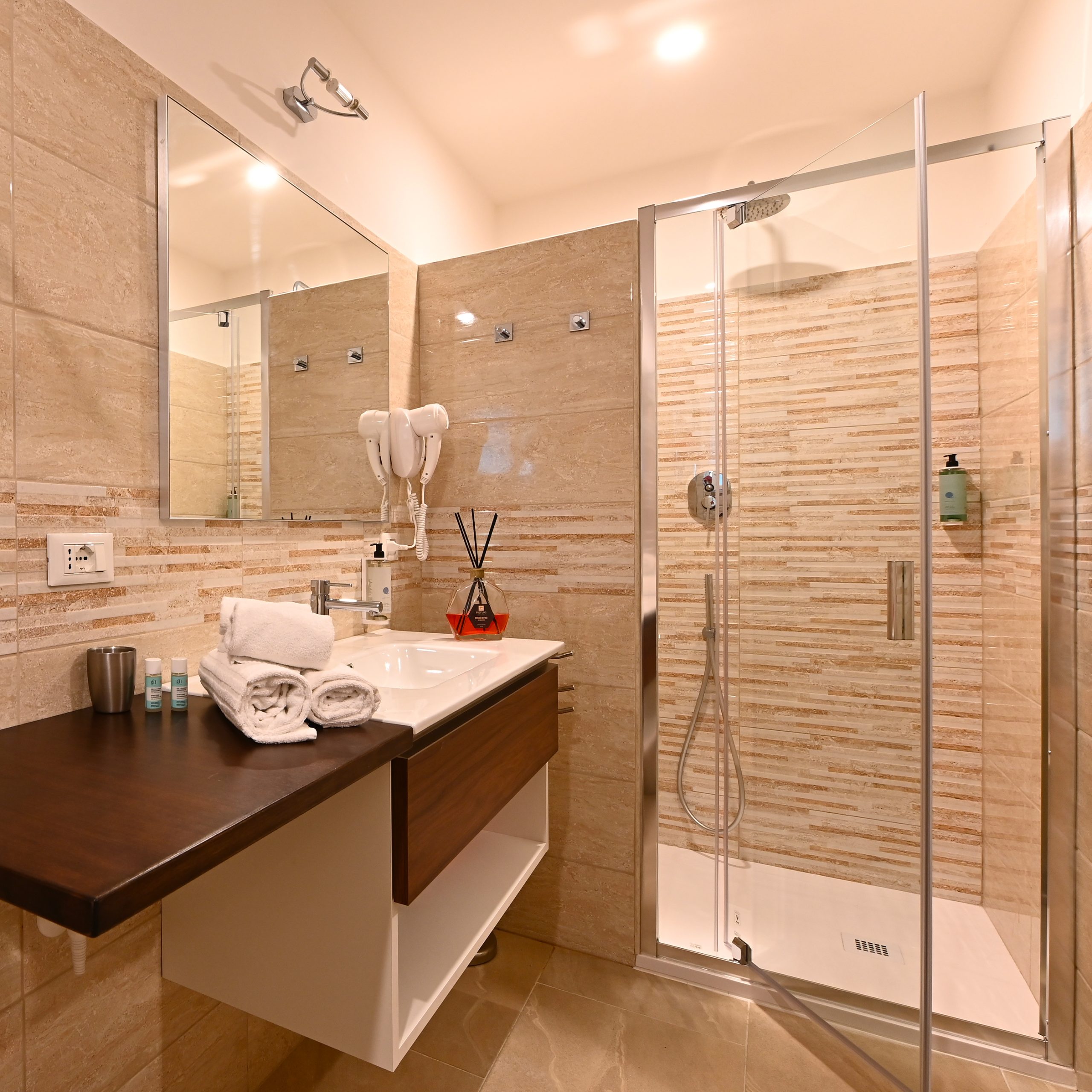Bagno dotato di ampia e confortevole doccia, asciuga capelli e biancheria.